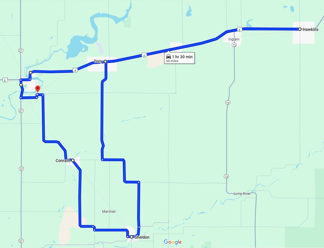 Our WEST and EAST County Routes follow a designated route before returning to Ladysmith.